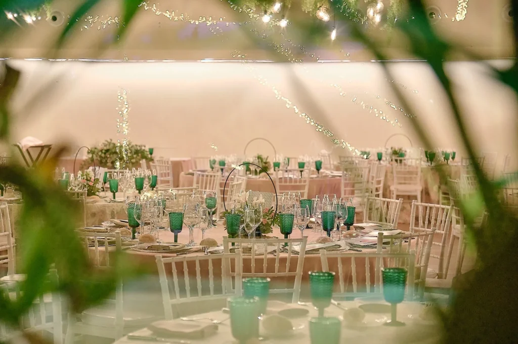 Salón exterior iluminado con candelabros altos y farolas elegantes entre palmeras.